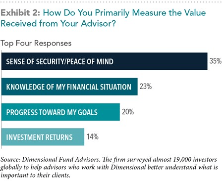 A recent survey conducted by Dimensional Fund Advisors found that, along with progress towards their goals, investors place a high value on the sense of security they receive from their relationship with a financial advisor.